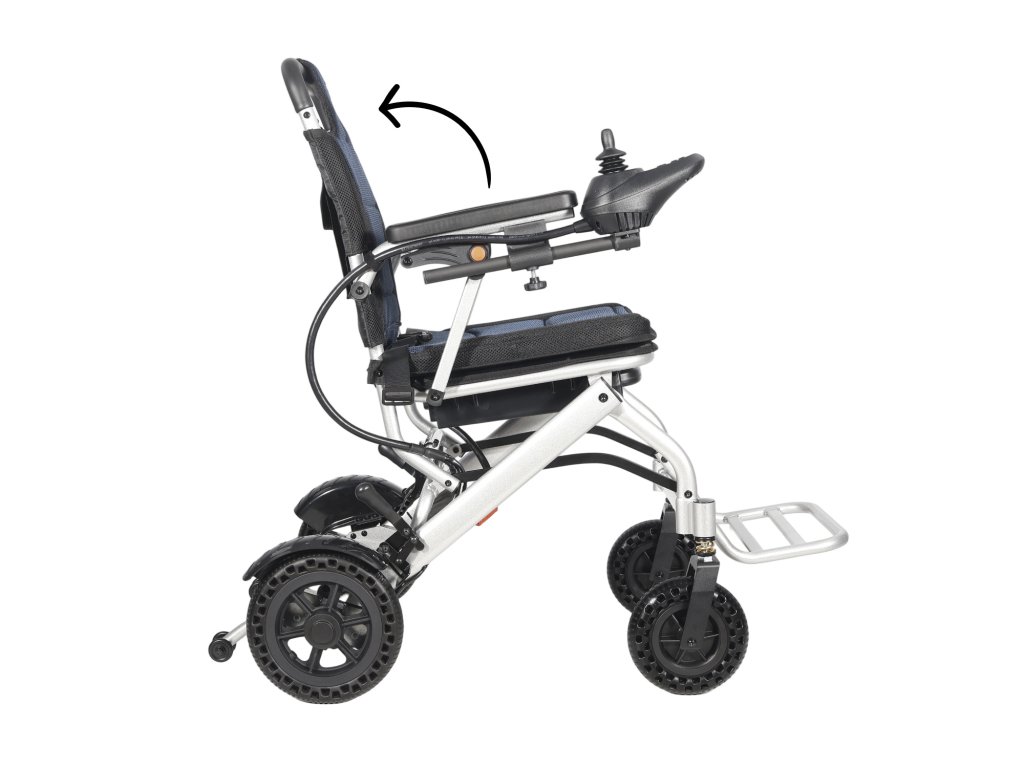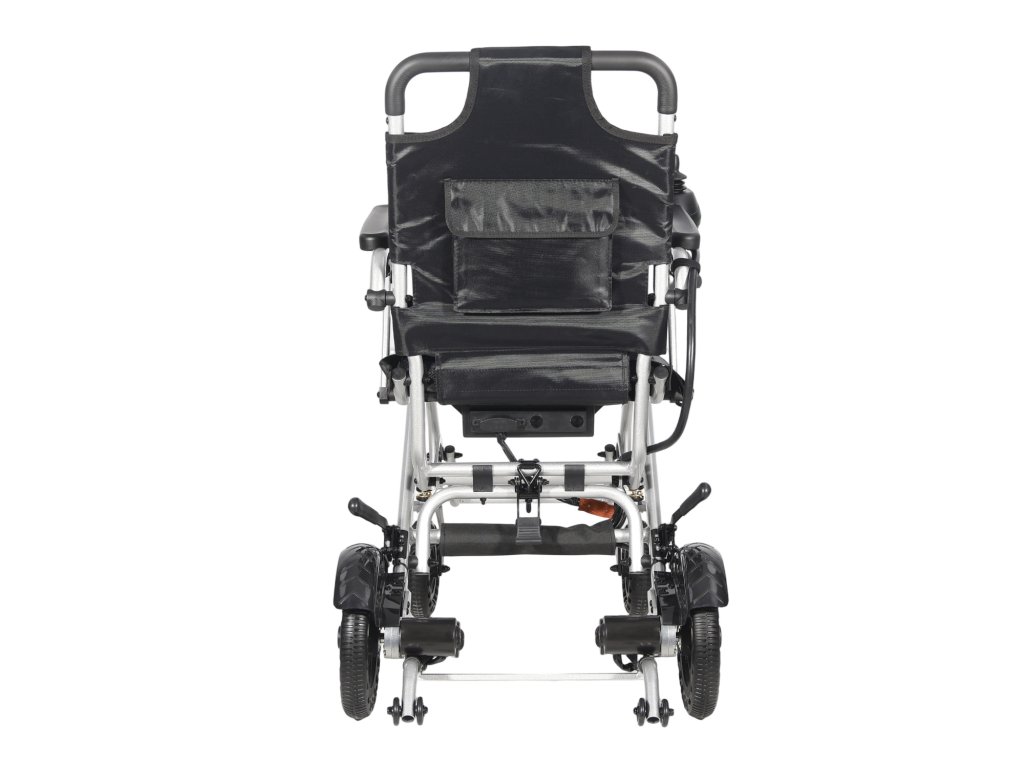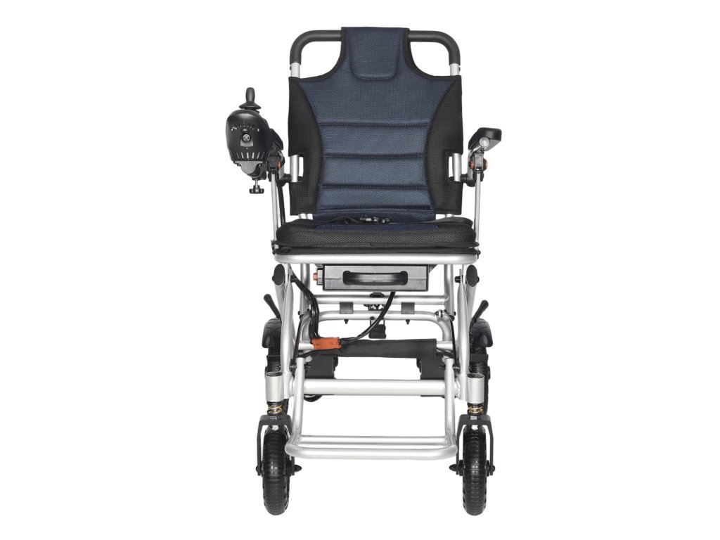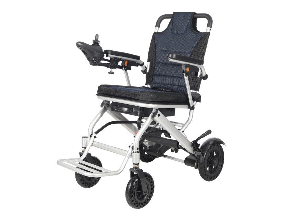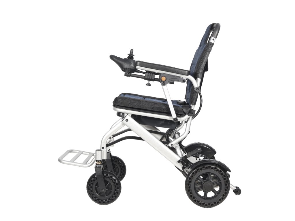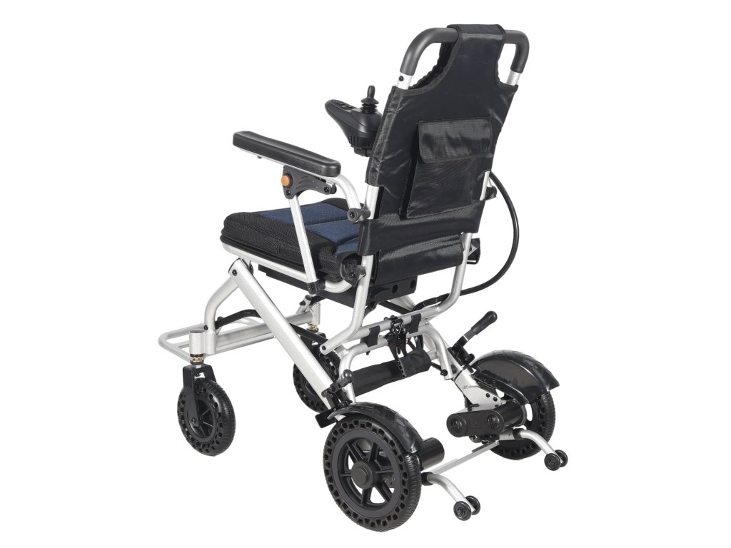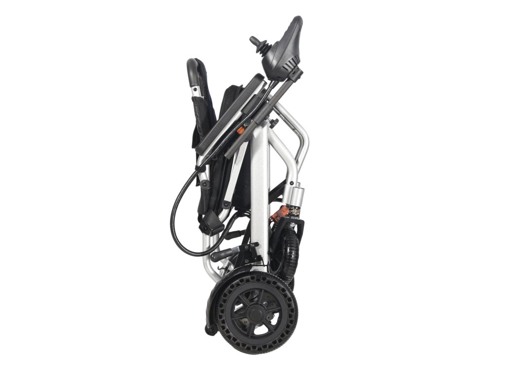Lehký skládací elektrický invalidní vozík s dojezdem až 15 km, nosností 100 kg a jednoduchým ovládáním joystickem. Ideální pro cestování i každodenní použití.